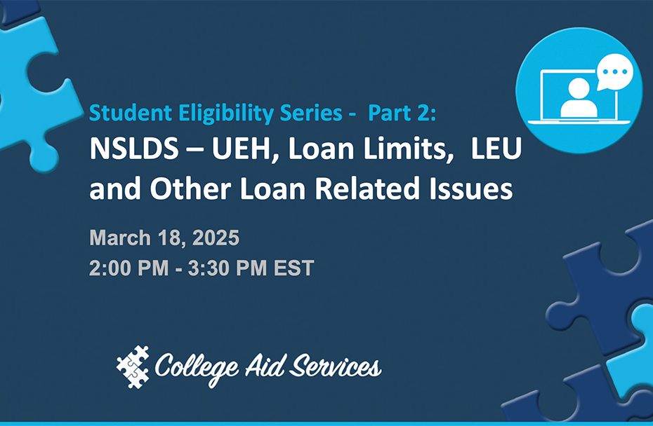 Join us as our panelists discuss how previous financial aid history can affect a student’s current eligibility. We will review Unusual Enrollment History (UEH), Aggregate loan limits, and Pell Lifetime Eligibility Used (LEU), and discuss the necessary steps that must be taken to evaluate these requirements.