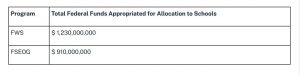 On March 15, 2025, President Trump signed into law, the Full-Year Continuing Appropriations and Extensions Act, 2025 (P.L. 119-2), which appropriated $1,230,000,000 for the Federal Work-Study (FWS) Program and $910,000,000 for the Federal Supplemental Educational Opportunity Grant (FSEOG) Program for the 2025–26 award year.